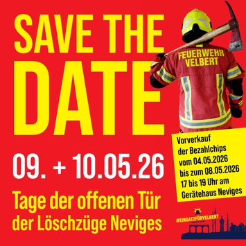 Velbert (ots) – Die Löschzüge Neviges laden in diesem Jahr am 09. und 10. Mai 2026 zu ihren Tagen der offenen Tür ein. Aufgrund der unmittelbaren Nähe zum Maifeiertag wurde die Veranstaltung in diesem Jahr vom üblichen ersten auf das zweite … Weiterlesen